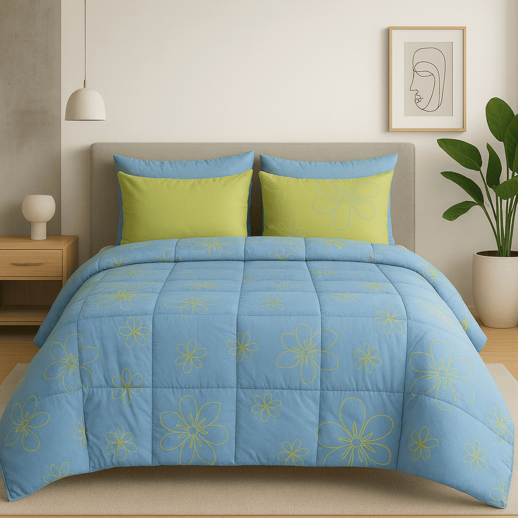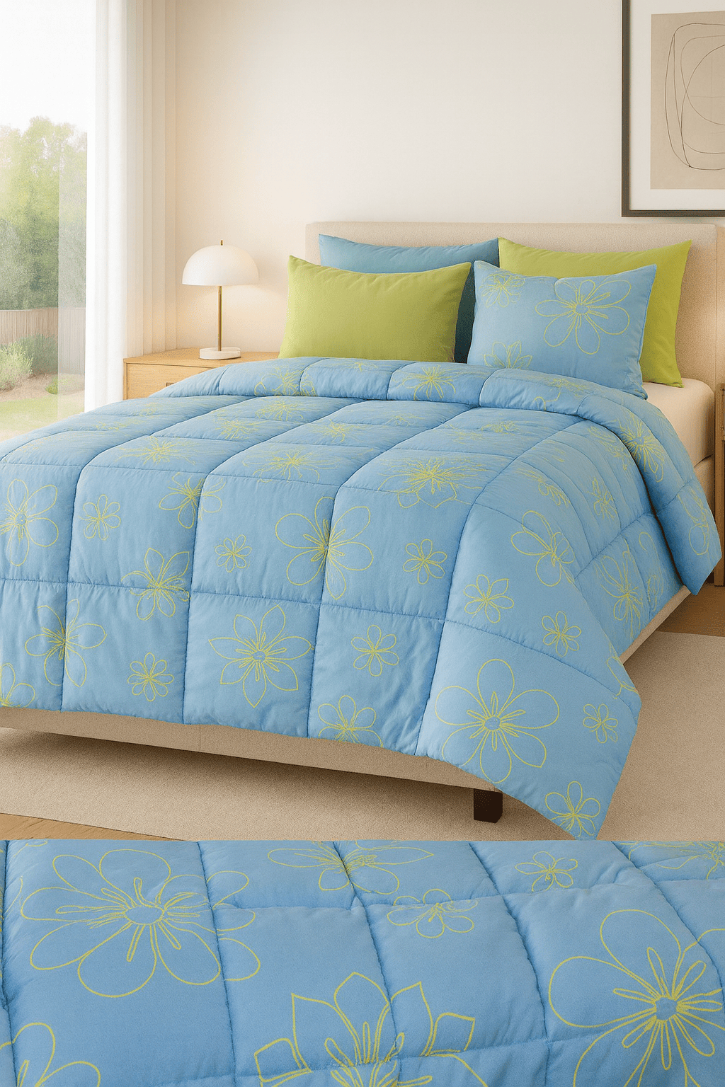 Ανακαλύψτε την απόλυτη ισορροπία ανάμεσα στη ζεστασιά, την ποιότητα και το στυλ με το διπλό Κουβερλί Mojo της σειράς Love Home. Το εκλεπτυσμένο τιρκουάζ χρώμα σε συνδυασμό με τα λαχανί λουλούδια δημιουργεί ένα ζωηρό αλλά και κομψό αποτέλεσμα, που δίνει φρεσκάδα και μοντέρνα πολυτέλεια σε κάθε κρεβατοκάμαρα.