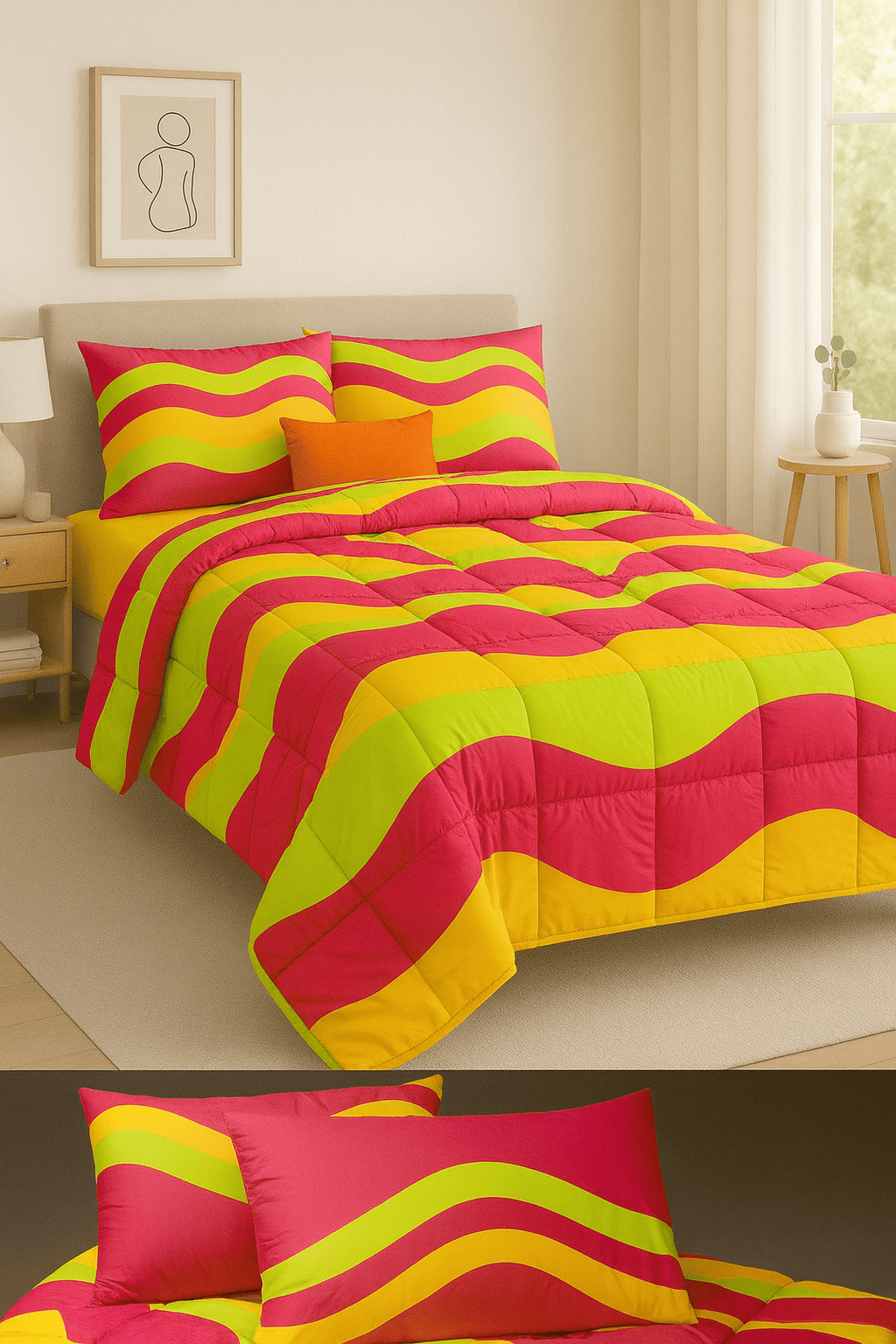Ανανεώστε την κρεβατοκάμαρά σας με το διπλό Κουβερλί 200×240 της σειράς Colors από τη Love Home. Ο μοντέρνος σχεδιασμός του συνδυάζει ζωντανά χρώματα σε τόνους ,λαχανί κίτρινο και φούξια, δημιουργώντας ένα δυναμικό γεωμετρικό μοτίβο που δίνει φρέσκια και κομψή αισθητική στον χώρο σας.