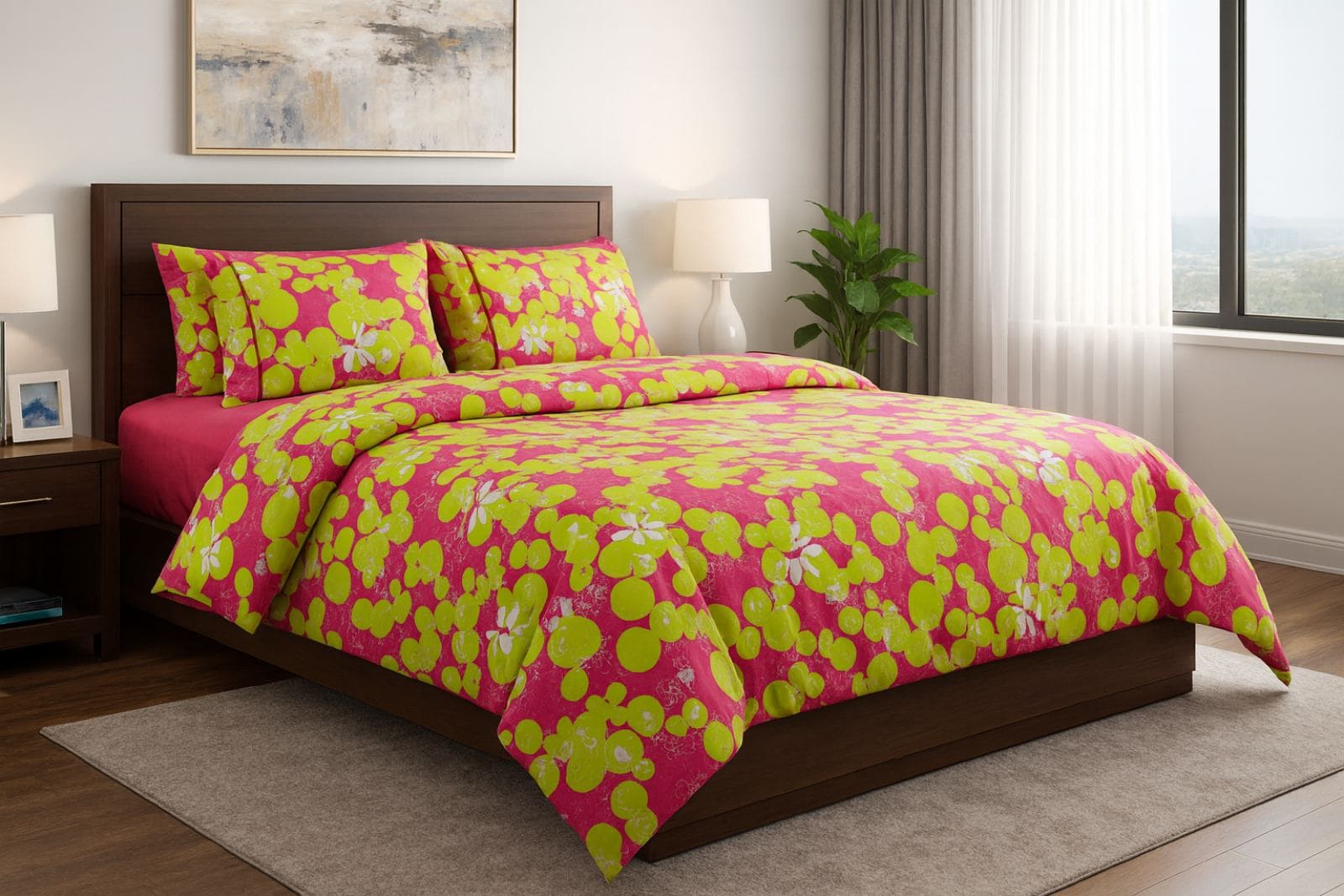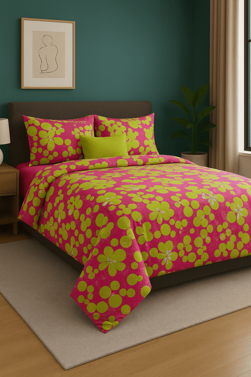 Ανανεώστε το υπνοδωμάτιό σας με την εντυπωσιακή διπλή παπλωματοθήκη Mojo της σειράς Love Home. Με ζωηρό φλοράλ μοτίβο σε αποχρώσεις πράσινου και φούξια, προσφέρει ένταση, μοντέρνο χαρακτήρα και αίσθηση πολυτέλειας που μεταμορφώνει τον χώρο.